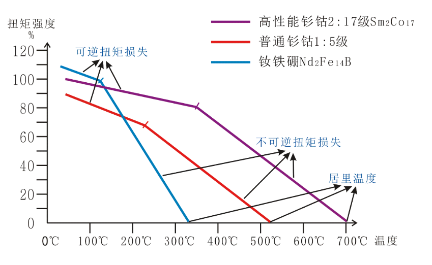 當溫度超250℃,普通釤鈷材質的磁鋼將會進入不可逆扭轉損失。